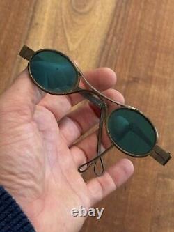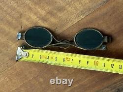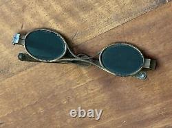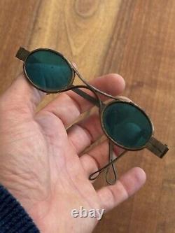 A pair of antique glasses with a solid silver frame, equipped with original tinted lenses and temples with loops typical of 19th-century sunglasses. Used in high mountains, deserts, or at sea, these glasses offered effective protection against bright light and glare.