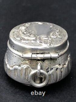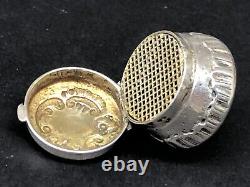 A very nice display item for collectors of small scent vinaigrette boxes. Height when closed: approximately 1.7 cm. Diameter at the widest point: approximately 2.3 cm. IN GOOD CONDITION, signs of use.For more information and/or photos, please feel free to contact me. I invite you to carefully read my payment instructions before bidding.