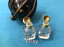 Etonnante et ancienne cave à parfums à suspendre figurant une noix, 19 eme. Armature en laiton emprisonnant 2 flacons en cristal taillé aux bouchons en vermeil poinçonné. Les petits bouchons en verre sont présents.