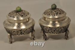 Poids total : 93,9 grammes. En bon état d'occasion. Manque une petite rondelle en argent sur l'une des poignées en pierre. Non poinçonnés, le métal a été dûment testé à l'acide et sera garanti par une facture remise à l'acheteur. Les photos font partie intégrante de l'annonce. Merci de bien les regarder. Very nice pair of antique Chinese solid silver table salt cellars, decorated with grapes and vine leaves. The feet are decorated with mice.The button handles are made of green stone, probably jade. Total weight: 93.9 grams. Small dents on the lids. Missing a small silver washer on one of the stone handles.