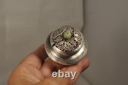 Très jolie paire de salières de table anciennes, en argent massif chinois, au décor de raisins et feuille de vigne. Les pieds sont au décor de souris. Les poignées boutons sont en pierre verte, probablement du jade.